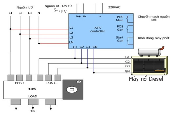 - Chuyển mạch tự động: Sau khi nhận diện mất điện từ nguồn chính, ATS sẽ gửi tín hiệu để kích hoạt máy phát điện dự phòng và sau đó chuyển tải dòng điện từ máy phát điện đến tải.