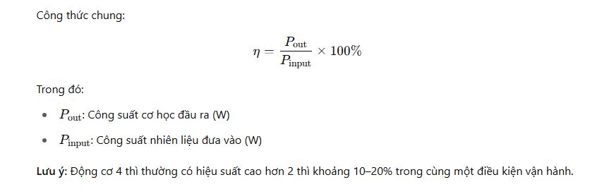 Lưu ý: Động cơ 4 thì thường có hiệu suất cao hơn 2 thì khoảng 10–20% trong cùng một điều kiện vận hành.