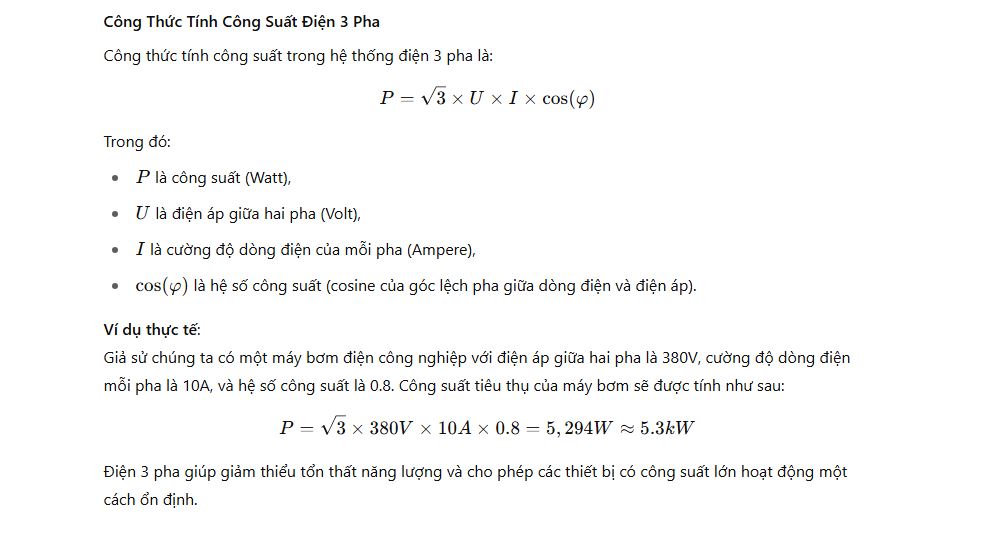 Công thức tính công suất trong hệ thống điện 3 pha là: